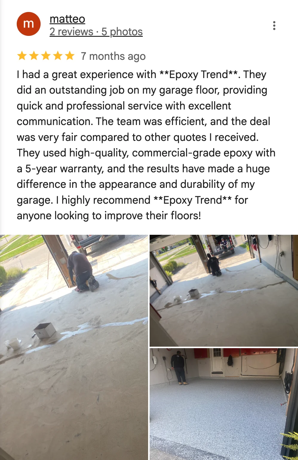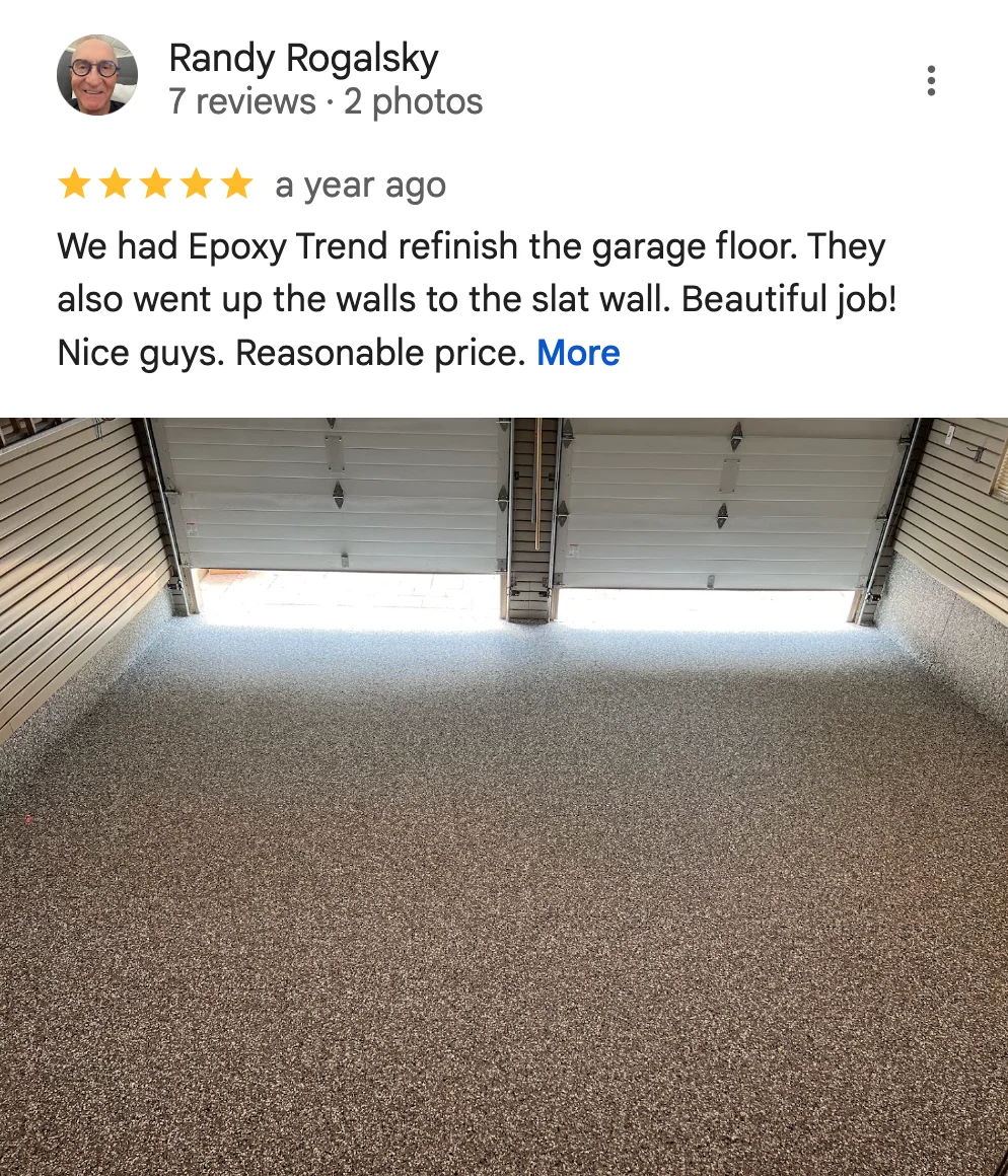 Trend epoxy flooring services maintain a stellar reputation with consistent 5-star reviews on Facebook and Google, demonstrating our commitment to excellence and client satisfaction.